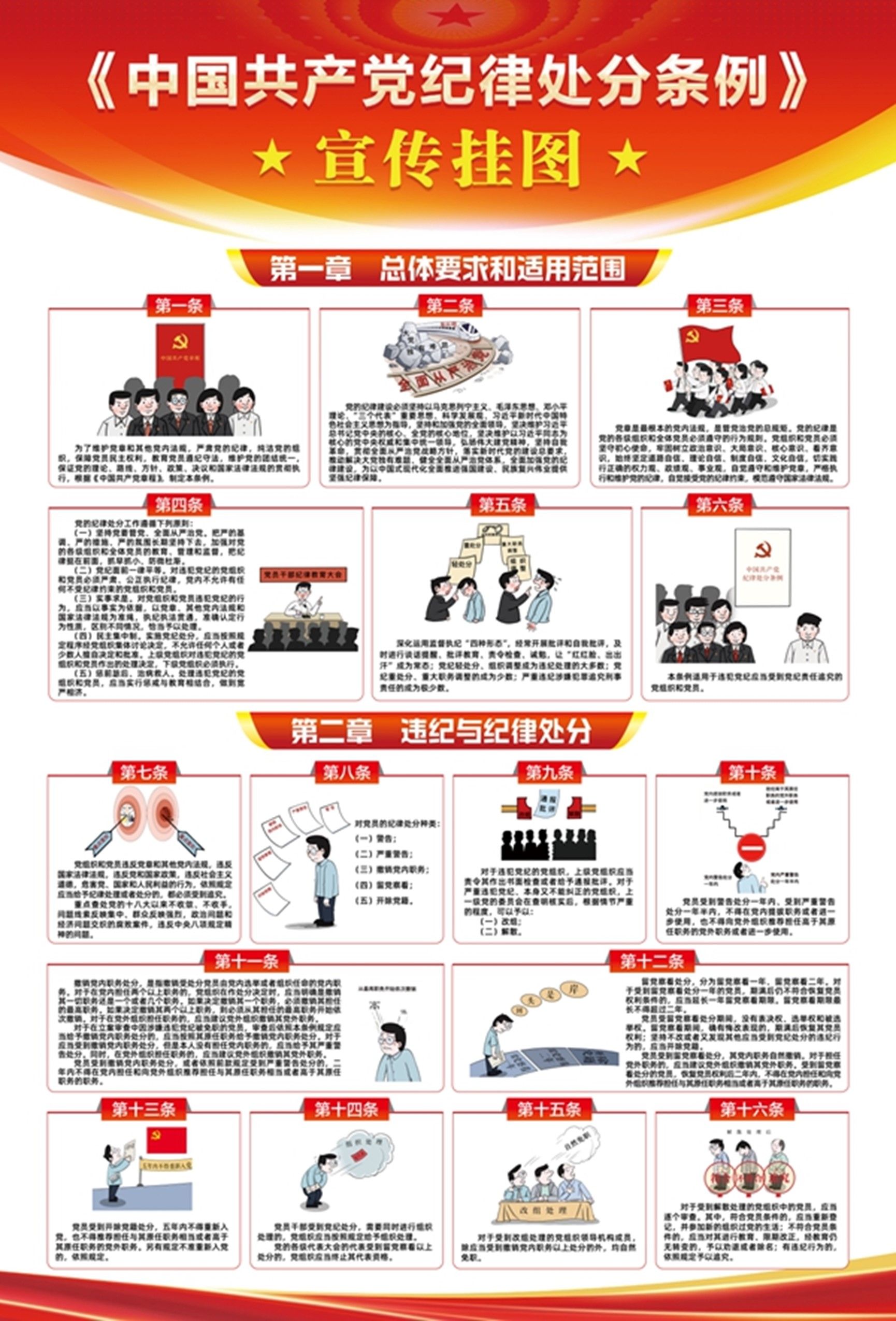 宣传挂图由中央纪委国家监委中国方正出版社出版,共10150幅漫画,逐条阐释和宣传《条例》具体内容,重点突出明令禁止的负面行为,生动阐释了党员、干部能干什么、不能干什么,是普及纪律知识的生动载体。